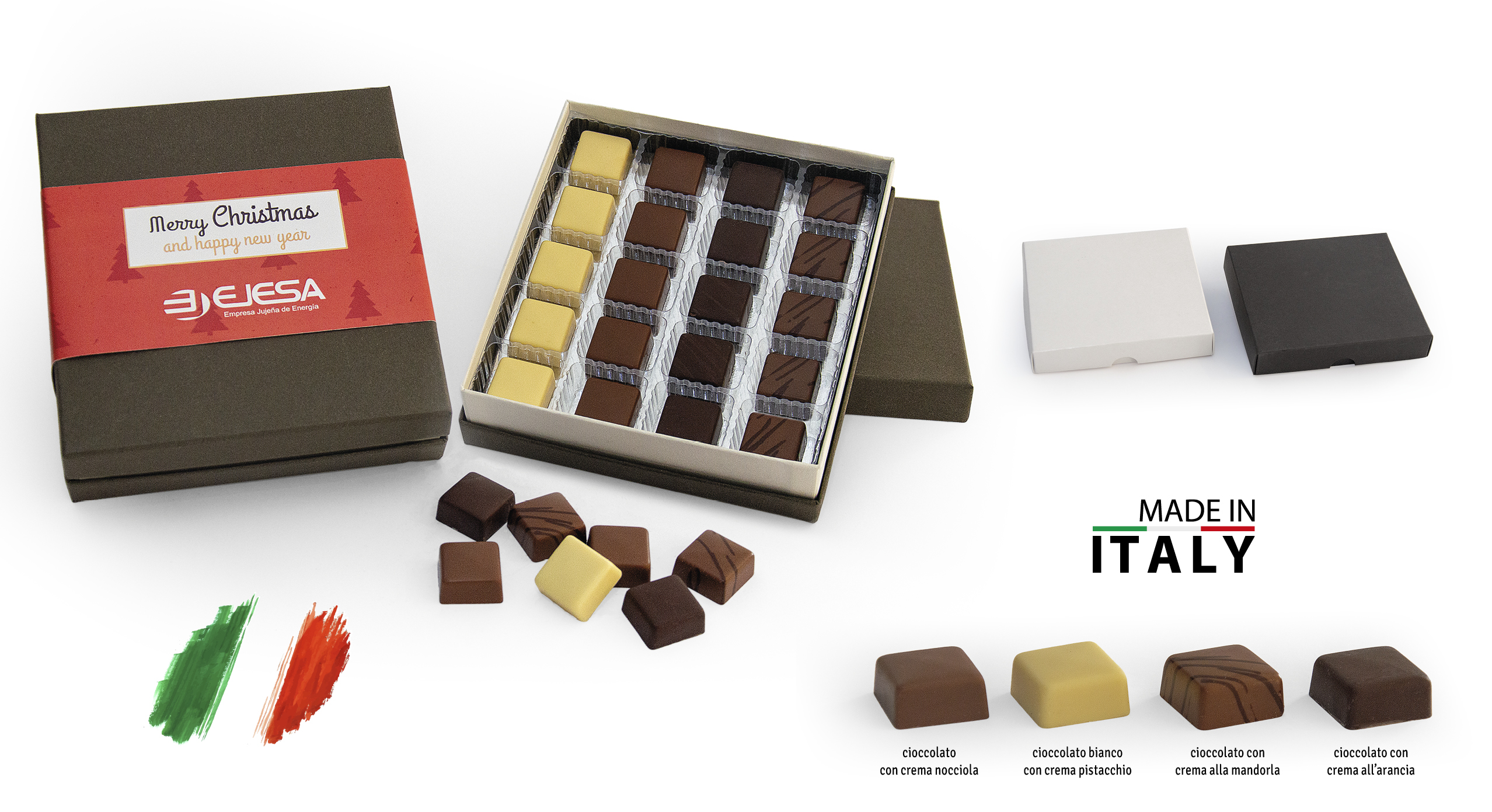 Elegante scatola cartonata rigida in colore bianco avorio o marrone, f.to 150x160x45 mm. Contenente al suo interno 20 cioccolatini quadrotti in 4 gusti diversi: con crema nocciola, cioccolato bianco con crema pistacchio, cioccolato con crema alla mandorla, cioccolato con crema all’arancia. Cadauna scatola ca 150 gr.Minimo pz. 50 scatole. Data scadenza 3/6 mesi. Consegna ca 15/20 gg da approvazione bozza